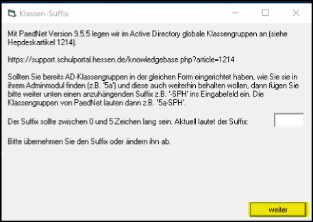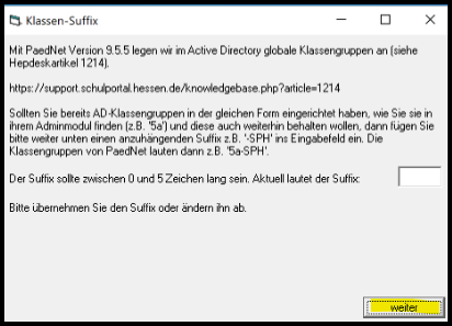 Belassen Sie die Voreinstellung und klicken Sie auf "Weiter" um ihren Server neu zu starten: - Abfrage Klassen-Suffix (Bitte genau durchlesen!):