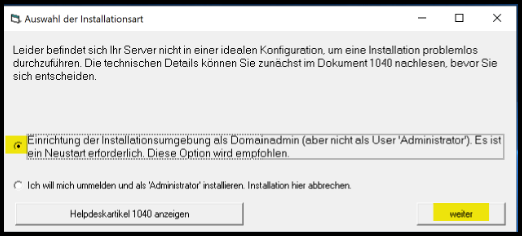 Das Installationsprogramm erkennt, dass Sie nicht als User "Administrator" angemeldet sind und bietet einen Neustart des Servers zur Fortsetzung an.
