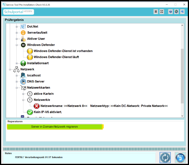 - Im Anschluss an den Serverneustart startet das ServiceTool im "Server-Check".